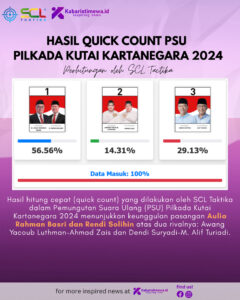 Kabaristimewa.id, Kutai Kartanegara – Lembaga survei SCL Taktika merilis hasil hitung cepat Pemungutan Suara Ulang (PSU) Pilkada Kutai Kartanegara 2024. Hasil sementara menunjukkan pasangan Aulia